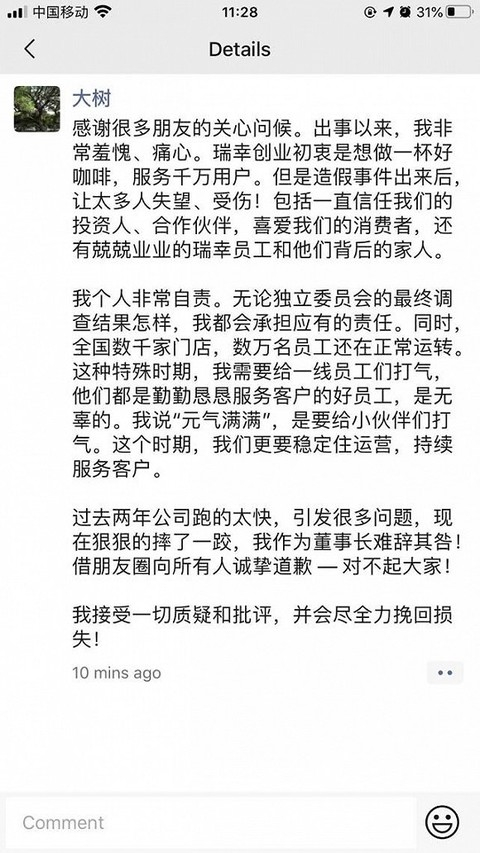 而在瑞幸咖啡被曝出财务造假的次日,陆正耀也在朋友圈首度发声,发文称,“今天更要元气满满!小伙伴加油!”但并未直接正面回应关于财务造假一事。