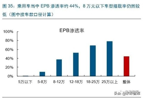 近年来,许多中高档乘用车将传统的机械式驻车制动系统升级成为由电子控制单元控制 的电子驻车系统,但经济型车型搭载率仍有提升空间,目前市场整体搭载率在 40%-50% 之间,12 万元以下车型在 40%以下,其中即便是一线合资以及自主品牌在 8 万元以下 级别市场当中 EPB 搭载率也仍然较低。