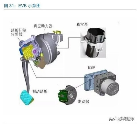 目前主流方案——电子真空助力器( electronic vacuum booster,EVB) +ABS(+ESC):1)早期自动刹车主要由 ESC 完成,ESC 能提供从储存泵中提供刹车力,但 ESC 的缺 点是刹车力度较小(约 0.5g,标准刹车 0.8g),另一方面频繁调用会影响寿命。2)EVB 的出现让自动刹车的主要力量提供由 EVB 提供,通过电子真空泵(EVP)快速抽真空 实现制动力的提供,是现阶段的主流方案。