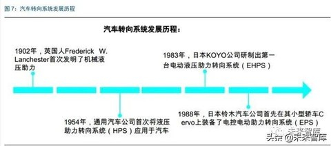 随着科技的迅猛发展,汽车转向系统也迎来了不断的升级和发展。20 世纪初,英国首次 发明了机械液压助力。1954 年,通用汽车公司首次将液压助力转向系统应用于汽车。
