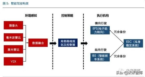 控制执行:IBS、EPS 和 ESC 打造底盘执行机构铁三角,智能驾驶对制动系统升级更 为迫切。执行机构通过对环境感知信息进行处理下达执行机构命令,实现最终的自动刹 车、自动转向等功能。目前,IBS(智能刹车系统)、EPS(电子助力转向)和 ESC(电 子车身稳定系统)是保障执行机构的铁三角组合,其中 IBSESC 属于电控制动系统, EPS 属于助力转向系统。以博世的执行机构系统构架为例,未来 IBS、EPS 分别作为纵 向控制和横向控制的主要执行机构,而 ESC 作为转向和刹车的备份系统提供双保险。智能驾驶更多主要为刹车等纵向控制,对于 IBS、ESC有刚性的需求,带来纵向执行结 构的迫切升级。