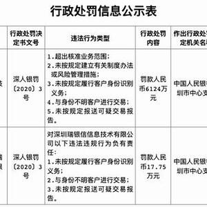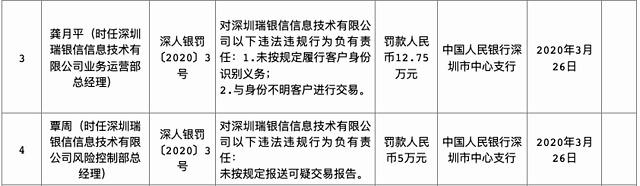 具体来看,央行深圳中心支行4月3日披露的消息显示,深圳瑞银信信息技术有限公司(下称“瑞银信”)存在超出核准业务范围、未按规定建立有关制度办法或风险管理措施、未按规定履行客户身份识别义务、与身份不明客户进行交易、未按规定报送可疑交易报告的违法行为。