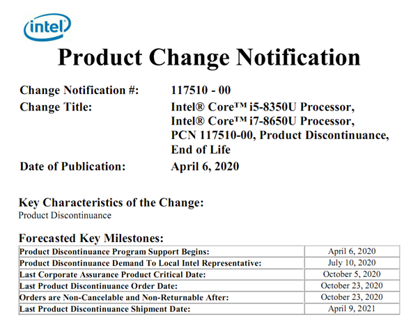 根据最新通告,i5-8250U、i7-8550U将在2020年7月24日之后停止接受订单,2021年1月22日停止出货;i5-8350U、i7-8650U能多活三个月,2020年10月23日之后停止接单,2021年4月9日后断货。