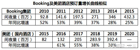 Booking在2010年酒店预订量突破1亿间夜的时候,连续两年增速都达到50%以上,随后两年的增速又依然维持38%左右,从而一举突破1亿、2亿、3亿的关口。美团在这个阶段的增长曲线跟Booking非常接近,突破1亿后维持55%以上的增速,随后两年维持38%的增速,只是稍微更快一点。