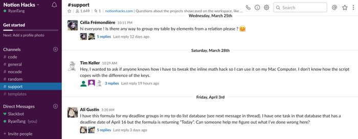 我还加了一个名为「Notion Hacks」的 Slack 群组,里面每天有大量关于 Notion 使用技巧和新发现的讨论,非常有趣!