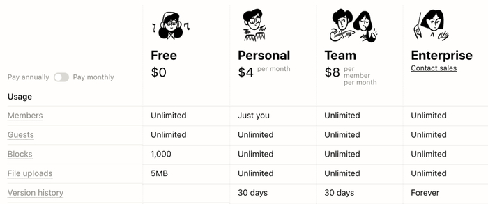 Notion 的商业模式很简单,基础功能免费,高级功能付费。