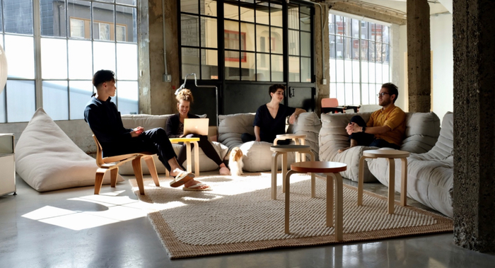 他们进入工作区是需要换鞋的,穿着拖鞋、坐在沙发上、旁边有大家的宠物小狗,很惬意。