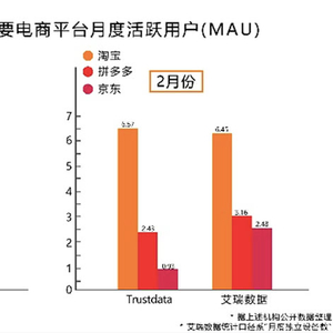 3月26日,知名的大数据监测平台Trustdata发布了今年2月“移动互联网全行业排行榜”。数据显示,淘宝月活用户(MAU)高达6.57亿,拼多多为2.43亿,而京东仅为0.9亿,排名第一的淘宝月活用户超出拼多多近3倍。
