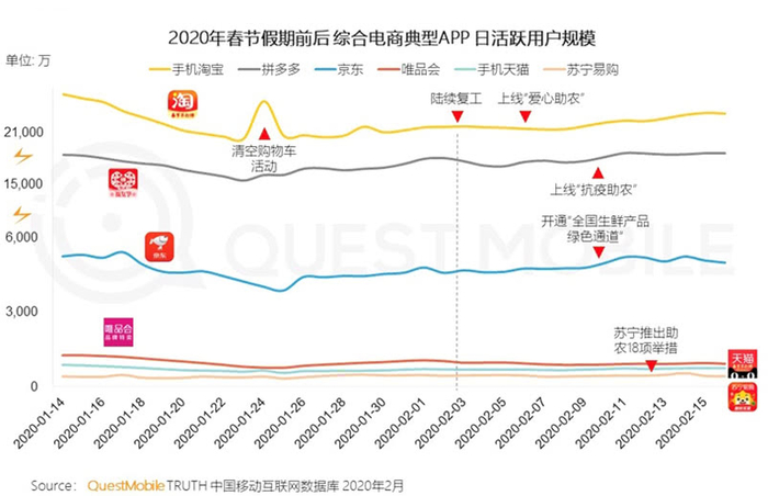 QuestMobile在今年2月发布的“中国移动互联网‘战疫’专题报告”指出,2020年春节前后,淘宝高居综合电商APP日活跃用户榜单的榜首,尤其是在陆续复工过程中,淘宝通过清空“购物车”、上线“爱心助农”等活动有效刺激了网络购物的增长,对经济回暖促进作用明显。