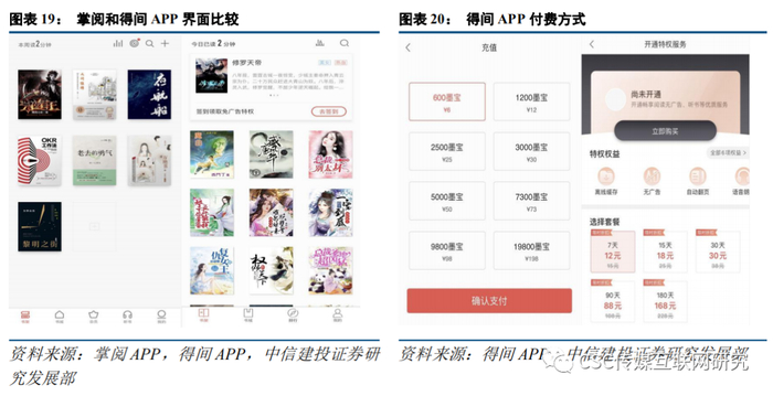 得间APP开拓广告和付费业务双重变现。与掌阅APP相比,得间APP最大的区别在于免费内容界面下均有广告,但广告对文字内容的遮挡和干扰程度较小,整体阅读体验较好;得间APP在内容排布上,原创免费内容多来自于旗下书山中文网、红薯中文网和有乐中文网等,而出版内容大多为较小知名度作品,头部精品内容相对较少。如用户希望在得间APP上享有离线缓存、无广告、自动翻页和语音朗读等功能,则需开通VIP服务,该服务相比掌阅APP会员价格略高,7天/15天/30天/90天/180天的价格分别为12元/18元/30元/88元/168元。而用户在观看漫画和收听有声内容时,需购买虚拟货币“墨宝”,该虚拟货币类似于“阅饼”,价格上也是“1元=100墨宝”。参考泛娱乐行业中的长视频、音乐等行业,我们认为未来阅读市场中,免费和付费的融合将是大趋势。就掌阅APP和得间APP来看,其在阅读方式和付费模式上本身就具有较大相似度。而从掌阅过去的付费用户数据来看,月度活跃用户中仅有不到3%的用户进行了付费。也就是说在付费阅读产品中,97%的用户既没有为APP贡献充值收入,也没有形成广告收入。在数字阅读内容较为庞大的用户基础上进行免费变现的方式,已经被七猫、番茄等产品得到了验证。我们认为未来免费/付费数字阅读平台不会有太大的区隔,免费和付费用户可以良性共生于同一个平台中。目前国内在线音乐和在线视频平台在这方面的商业模式已较为成熟,如在线音乐平台免费用户仅能收听部分歌曲,且在歌曲音质上无法选择最优音质,而付费会员用户可以收听绝大多数歌曲,且在歌曲音质上可自由选择;同时长视频平台也有类似模式,免费用户仅能收看部分内容,且需观看相当时长的广告,而付费会员用户可以免广告观看绝大部分的视频内容。我们预计,接下来移动阅读行业的产品形态会逐步向长视频和在线音乐的模式过渡,在一款产品中同时承载付费和免费两类不同的用户,且能同时保证两类用户有较好的使用体验。免费和付费模式的结合,既能让大多数免费用户享受到基础内容,又能通过产品差异化和内容形态的差异化筛选出愿意为优质体验和优质内容付费的用户。