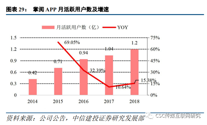 版本迭代成熟,月活跃用户数增长放缓。根据公司公告披露,从2014年到2018年公司月度活跃用户数(MAU)由4200万增长至1.2亿,年复合增长率达到23.36%。在移动互联网发展的早期,公司用户增长较快,但是随着整体移动互联网用户红利逐步消失,2017-2018年公司月度活跃用户的同比增长率已经回落至20%以内。截至2019年H1,掌阅APP月活跃用户数超过1.2亿,用户月人均使用时长达237分钟,仍然是国内移动阅读领域活跃用户第一的独立APP。同时,随着掌阅APP版本迭代,精装排版、护眼模式、听书等功能逐渐上线,较好地增强了用户体验;而“圈子”、“想法”、“开卷”等功能的上线,使得用户之间的交互性显著提升,同时也使得不同圈层的用户群体逐渐形成,一定程度上增加了用户粘性。