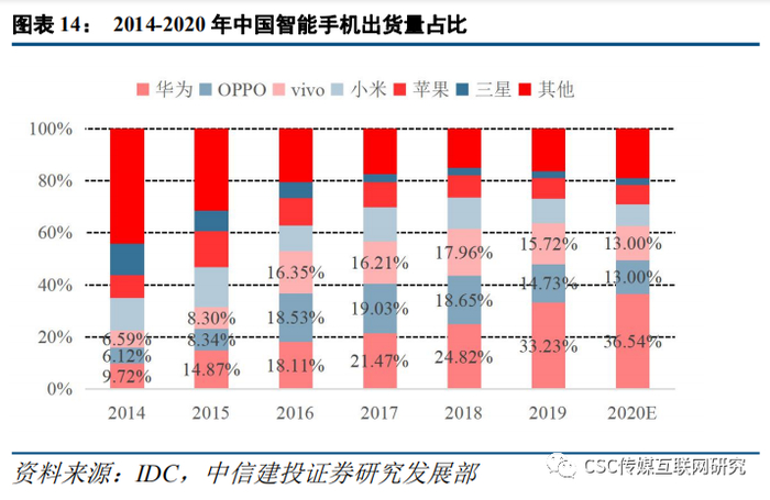2.1.2国产手机厂商快速发展,提供新机遇1)国产手机厂商出货量的爆发有望带动掌阅用户增长。根据IDC数据,近几年华为、OPPO、vivo等国产手机的国内总出货量快速增长,从2015年的1.33亿台增长至2019年的2.69亿台,年均复合增长率近20%,为掌阅带来了巨大的潜在新增用户。其中,华为手机的出货量保持了较高的增速,2017/2018/2019年分别增长19%/16%/34%。vivo手机出货量从2014-2015年的2,700和3,500万台迅速增长至2016年以后的年出货量7,000万台的水平。类似的还有OPPO手机,目前其年出货量也达到8,000万台的水平。从中国市场手机出货量占比来看,到2019年华为、OPPO、VIVO三家公司占整体国内市场出货量已经达到62.54%,合计出货2.64亿台。国产头部手机厂商的强势,不断挤压外资品牌和其他品牌的市场份额。2019年三星和苹果合计出货量为4450万台,出货量占比仅为10.52%。而除开“华米OV”四家国产手机厂商,以及苹果三星两家海外厂商外,其他手机厂商2019年合计出货量占比仅为16.35%。掌阅在早期与华为、OPPO、vivo三家公司建立起了较好的合作关系。随着三家公司在国内手机市场销量的不断提升,也为掌阅带来了相应的潜在新增用户。