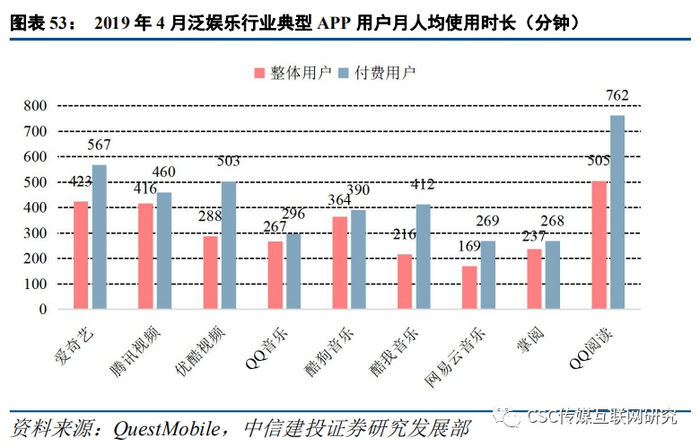 根据QuestMobile,截至2019年4月泛娱乐用户规模达到10.86亿,月人均使用时长同比增长13.8%,在月活跃用户规模同比增量TOP5中,数字阅读位居第二,超过在线音乐和长视频,月活用户较2018年4月增长了7,157万,同比增长18.4%,其增长主要来自于免费阅读模式拉动的新市场。从2018年3月到2019年3月,泛娱乐行业中的移动视频发展迅猛,泛娱乐用户在移动视频上的月总使用时长占比从17.9%增长到了21.3%,数字阅读行业虽然受到了一些影响,但影响不大,仅从2.8%降至2.5%,减少了0.3个百分点,说明移动视频行业的发展并没有从数字阅读用户这里抢占太多的使用时长。根据QuestMobile对泛娱乐行业典型APP的统计,数字阅读行业中QQ阅读整体和付费用户的月度使用时长分别为505/762分钟,超过爱奇艺、腾讯视频、QQ音乐等视频和音乐领域的头部应用。
