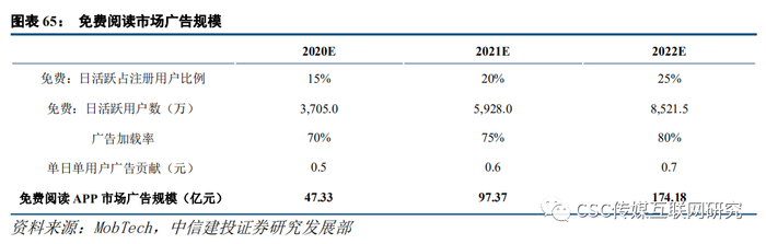 2)付费阅读根据BigData数据,2018年主要的付费阅读APP为掌阅、QQ阅读和书旗小说,其日活跃用户数分别为2,042.4、1,660.9和1,467.6万,而主要付费阅读APP日活跃用户数总计为7,175.5万,据此估计付费阅读APP日活跃用户总数占注册用户比例在18%左右。而2019年免费阅读APP会挤占一部分付费阅读的市场空间,当年付费阅读APP日活跃用户总数将明显下降,但随着付费阅读注册(装机)用户数的下滑,未来付费阅读APP日活跃用户总数占比有望小幅提升。因此我们假设,2020/2021/2022年付费阅读APP日活跃用户总数占注册用户的比例分别为12%/13%/14%,对应付费阅读APP日活跃用户总数分别为3,705/5,928/8,521.5万。由于付费阅读APP过去较为偏重用户的阅读体验,因此该类产品在前期进行广告变现时会相对谨慎,随着产品功能的不断调试,其广告变现能力将有较快的提升。因此我们假设付费阅读APP广告加载率在2020/2021/2022年分别为15%/20%/25%,单日单用户广告贡献分别为0.3/0.4/0.5元。而付费阅读市场广告规模拆分为付费阅读APP日活跃用户数*广告加载率*单日单用户广告贡献,由此计算,2020-2022年付费阅读APP市场广告规模分别为7.27/13.57/22.15亿元,对应同比增速分别为86.66%/63.23%。
