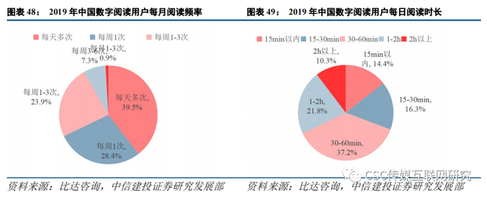 3.2数字阅读APP时长优势明显虽然以文字为核心的数字阅读,一定程度上受到了长短视频、游戏等娱乐形式的冲击,但是阅读类APP产品在时长上的优势仍然明显。中国音像与数字出版协会发布的《2018 中国数字阅读白皮书》显示,截至2018年,我国人均数字阅读量达12.4本,人均单次阅读时长达71.3分钟。根据比达咨询数据,2019年中国数字阅读用户每天阅读2小时以上的重度用户占到了10.3%,1-2小时的用户有21.8%,30-60分钟的占比37.2%。数字阅读在吸引用户时间投入上有较明显的优势。