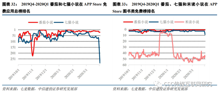 我们重点选取番茄小说、七猫小说和米读小说三款典型免费阅读APP进行分析。从榜单排名来看,根据七麦数据,2019Q4-2020Q1番茄小说和七猫小说在APP Store图书分类免费榜中排名始终比较靠前,且在2020年Q1,番茄小说几乎霸占了图书榜第一的位置;同时由于字节跳动的引流和春节期间的移动娱乐需求上升,春节前后近两周番茄小说在免费应用总榜中保持了前15的高位,1月20日至24日一度高居免费总榜第2-4名。七猫小说也稳定在图书分类免费榜的2-4名左右,处于行业领先地位。米读小说在2019年底和2020年初排名上升较快,但之后又有所下滑。