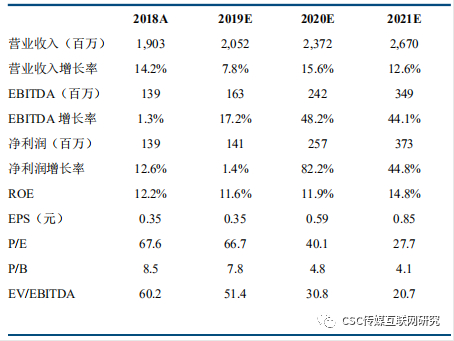 我们预计公司2019-2021年将实现归母净利润1.41、2.57、3.73亿元,同比增速为1.41%、82.19%和44.83%。预计公司2019-2021年分别实现EPS 0.35、0.59、0.85元,4月7日收盘价对应19-21年每股收益的市盈率分别为66.5x、40.1x和27.7x。首次覆盖予以买入评级。