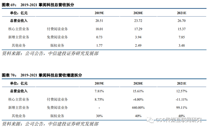 5.2 盈利预测2016-2018年掌阅科技总营收中,付费数字阅读业务的占比分别为94.07%/64.06%/87.02%,该业务为公司的核心主业;其他业务中,版权产品业务的占比分别为0.92%/2.22%/7.20%,占比不断上升,成为公司除数字阅读业务之外第二大收入来源。而随着2019年免费阅读行业的爆发式增长,未来公司在免费阅读业务上的收入也将有较大幅度的提升。结合前述对免费阅读市场的估算,我们对公司未来3年的盈利进行预测。2015-2018年,公司公告的月度活跃用户分别为0.71、0.94、1.04、1.2亿,考虑到公司随着华为、OPPO、VIVO等硬件出货量而实现新增用户覆盖及其活跃用户转化提升,假设2019-2021年公司月度活跃用户分别达到1.5/1.8/2亿人次。1)付费阅读业务:根据公司披露,2015-2018年公司数字阅读业务分别实现营业收入5.92、11.26、15.68和16.56亿元。结合公司公布的月度活跃用户数,可以推算平均每个活跃用户贡献的ARPU值分别为8.34/11.98/15.08/13.8元。由于免费阅读市场的兴起,一定程度上部分非核心付费用户转向免费阅读,我们假设2019-2021年平均单个活跃用户贡献的ARPU值分别下滑13%、20%和20%。由此可得,2019-2021年公司付费阅读实现营收18.0/17.3/15.4亿元,对应同比变动分别为8.75%/-4%/-11%。