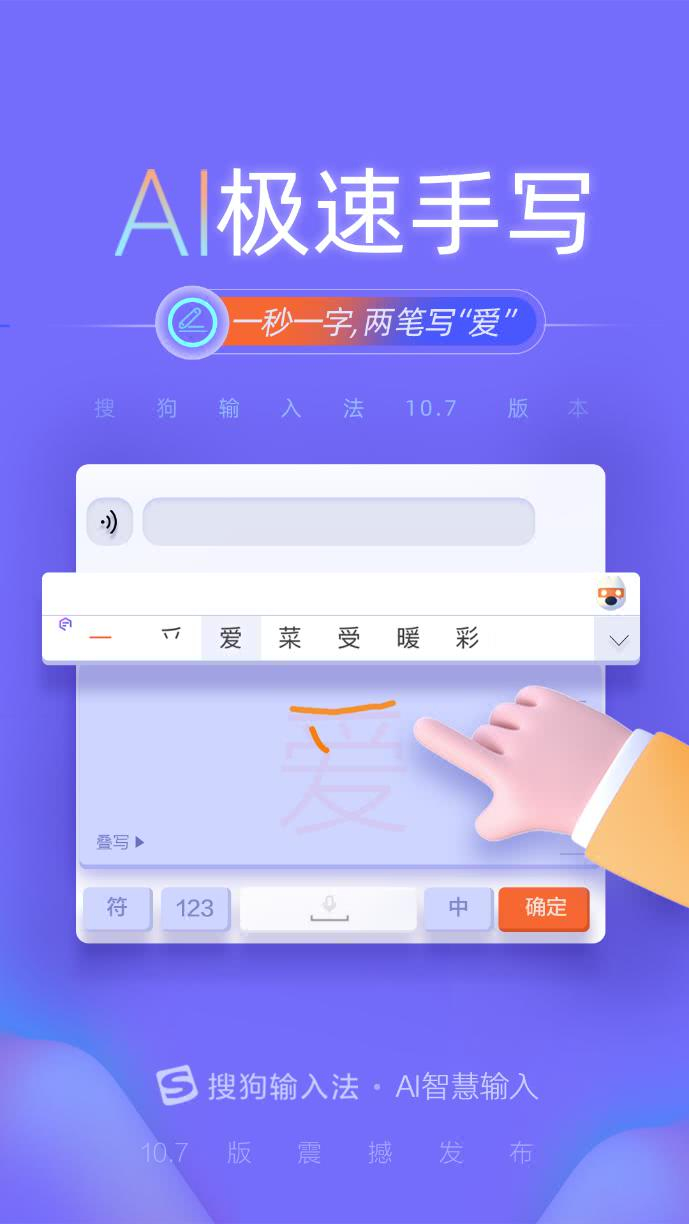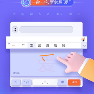 首先,新版搜狗输入法在国内首创推出了“手写补全”功能,用户只需写出文字偏旁或一部分笔画,就可以智能预测出整字帮助用户补全,让用户可以快速书写笔画复杂的汉字。比如手写输入“爱”字,只需要写出前两笔,搜狗输入法就可以智能预测用户可能书写的几个整字供用户备选,这大大提升了用户手写输入汉字的速度和准确率。
