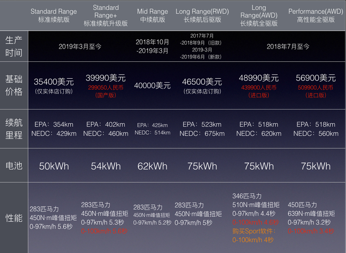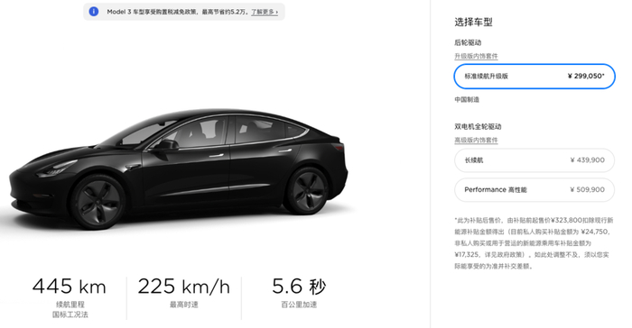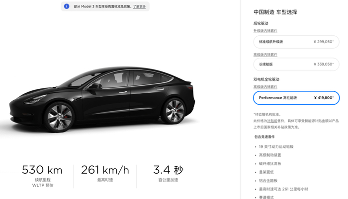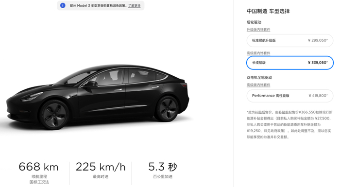 然而事情并没有这么简单,特斯拉在4月10日中午突然官宣,Model 3最长续航版本开启预订,售价为补贴后339050人民币,续航668km(国标工况),实际续航约为590km(EPA);但于此同时还公布了Performance版本也将国产化。