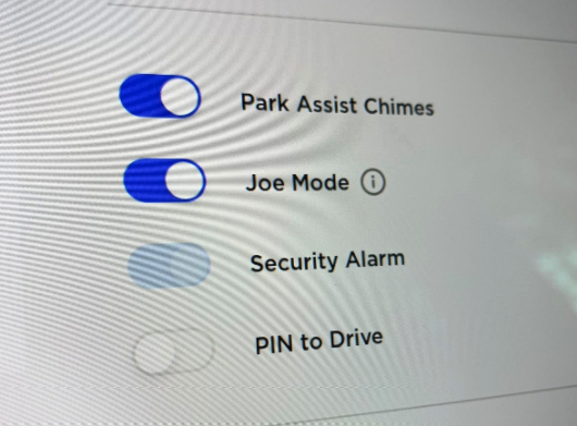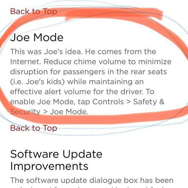 其一,特斯拉对用户的反馈相当重视,举一个例子:Joe Mode。很多车评人在浏览特斯拉系统菜单时候会发现一个叫“Joe Mode”的模式,虽然开启后通过说明文字知道有什么用,但却并不明白为何叫“Joe Mode”。