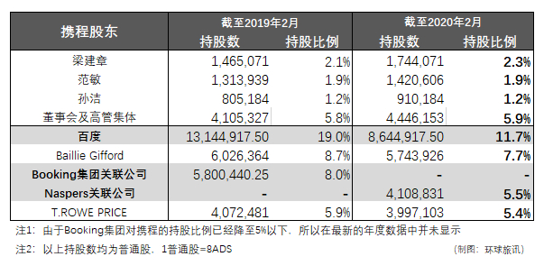 对比2019年和2020年,携程主要股东的持股情况有不少变化: