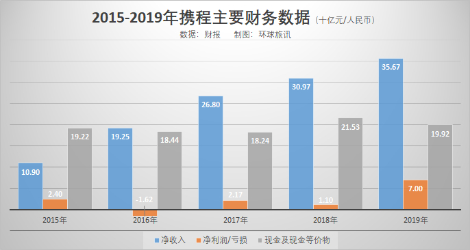 从2015年到2019年,携程的净收入持续上升,但相应年份的净利润/净亏损则波动较大,2016年携程净亏损16.24亿元人民币,这主要由于2015年底开始,去哪儿的财报并入了携程财报。