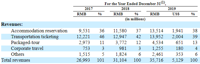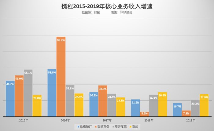 在四项核心业务中占比较小的商旅业务收入,从2015年到2019年的同比增速都较为稳定。