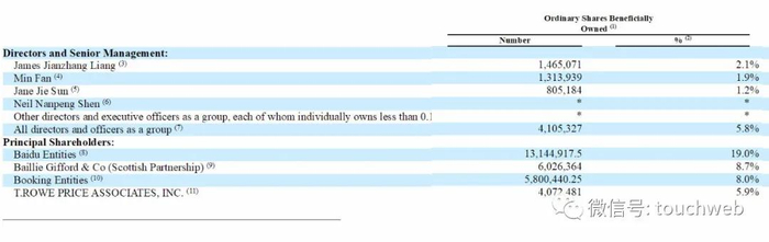 百度为携程最大股东,持股为19%;Baillie Gifford & Co (Scottish Partnership) 持股为8.7%,为第二大股东;