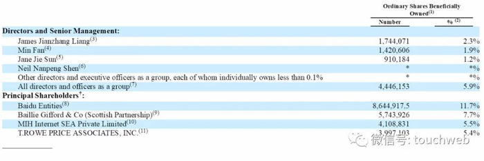 而截至2019年2月28日,携程一共有69,187,290股普通股。其中,梁建章持股为2.1%,范敏持股为1.9%,孙洁持股为1.2%。