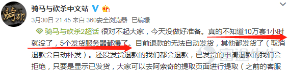 今年3月30日18点,《骑马与砍杀2:霸主》的EA版本正式上线Steam商城。游戏一经发售就登顶Steam热销榜榜首,而在骑马与砍杀中文站的淘宝分销路径,10万套激活码也在一小时内被抢购一空,发货服务器直接被挤爆。没过多久,游戏在线玩家数量就已接近20万,一度位列Steam热门游戏前三。