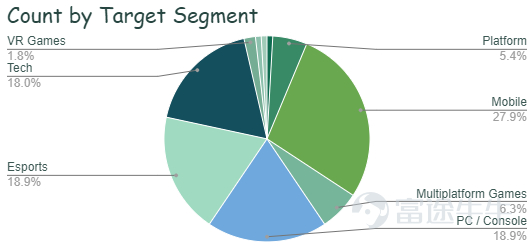 其中,移动平台领域投融资规模最大,占比接近28%;其次为主机、PC平台和电竞,占比均接近19%;之后是相关技术,占比为18%;在此之后分别为,平台游戏6.3%、游戏平台5.4%以及VR游戏1.8%。