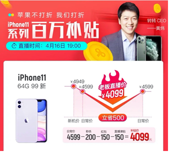 而今晚,转转CEO黄炜更是会首次在直播间为消费者送福利,放出百万补贴。届时同款iPhone 11的价格只需要4099元,不仅比官网便宜1400元,比新款iPhone SE也只高800元,但可以拥有双摄长续航的大屏体验,无疑更“香”!