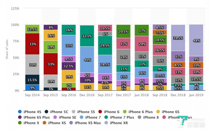 我们再来看另外一家数据统计网站 Statista 的一份报告,它统计了2014-2019年iPhone在美国的销量情况,可以直观地发现占比例最高的通常不是旗舰产品,在苹果总部所在地的美国,仍在使用iPhone 8代以及更早机器的用户同样也不少。