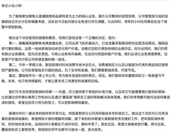 内部信中,陈琪提及,本轮裁员主要对部分业务进行优化调整,裁撤部分因历史原因遗留下来的业务,尤其是与其如今核心业务——电商直播偏离的部门。脉脉等平台数位认证为蘑菇街员工的用户也提供了更多的裁员细节。一位匿名信源称,除了陈琪所提及的部分业务线被砍:“层级高、入职时间短,但对业务没什么贡献,满足以上两个,基本被裁”。此外,匿名信源还表示,本轮裁员北京地区是重灾区。