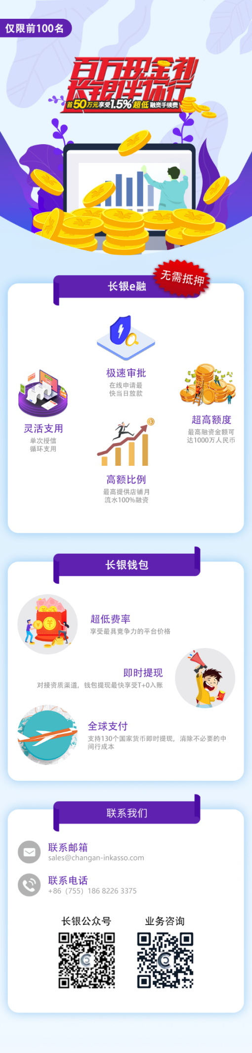 加速卖家资金周转、解决流动资金瓶颈、帮助卖家优化资金结构的同时,长安银科还为符合资质的卖家提供e融板块以及长银钱包双项费用优惠服务!