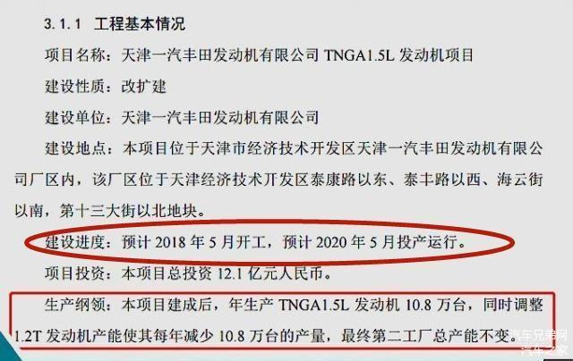早在2018年,丰田就已经有了建设三缸发动机生产线的计划,并且这个计划在2018年中得到了实施,于2018年5月正式开工。该项目建设在天津一汽丰田发动机有限公司内,总投资12.1亿人民币,计划2020年5月开始生产TNGA 1.5L发动机,年产量可以达到10.8万台,而现有的1.2T发动机则会减产10.8万台。