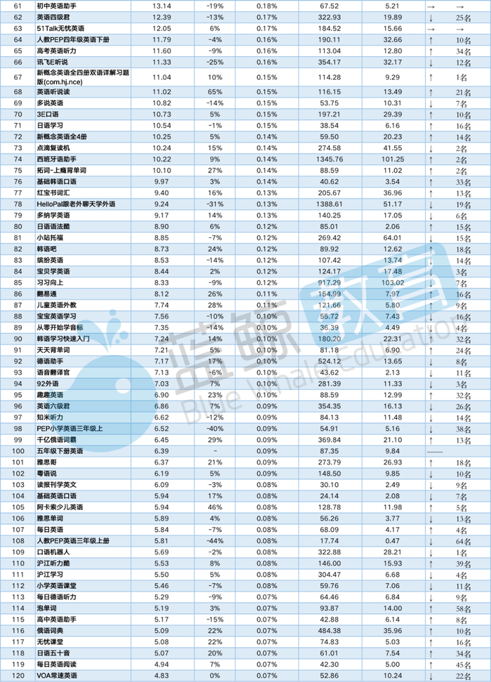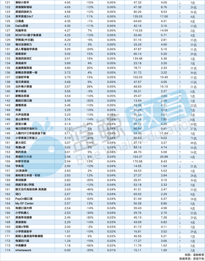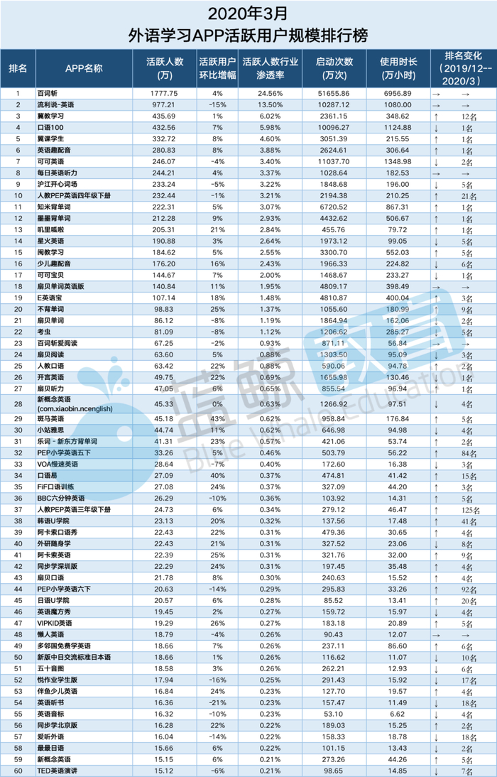 下面是本次考察的174个在线外语学习APP的详细排名,包含活跃人数、启动次数及使用时长等维度,另新加一排名变化维度,与2019年年末数据对比,考察2020年第一季度结束APP排名变化。