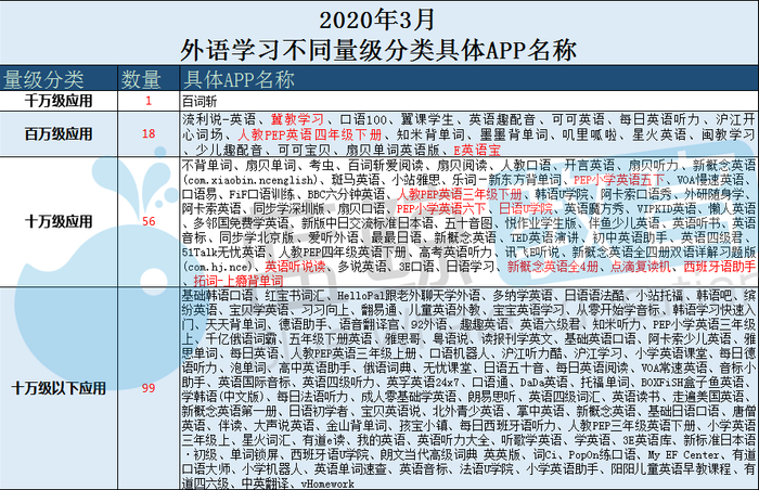 虽然2月末,“流利说”、“冀教学习”等表现亮眼,我们之前研究过中小学教育细分赛道,中小学教育头部应用“作业帮”在疫情的催化之下,用户数已破亿,详见《2月中小学教育APP排行榜:作业帮月活首破亿,猿题库入围千万级》,外语赛道月活最高“百词斩”还不到两千万用户,可见外语学习赛道的潜力很大,APP尚有很大成长空间,竞争持续激烈。