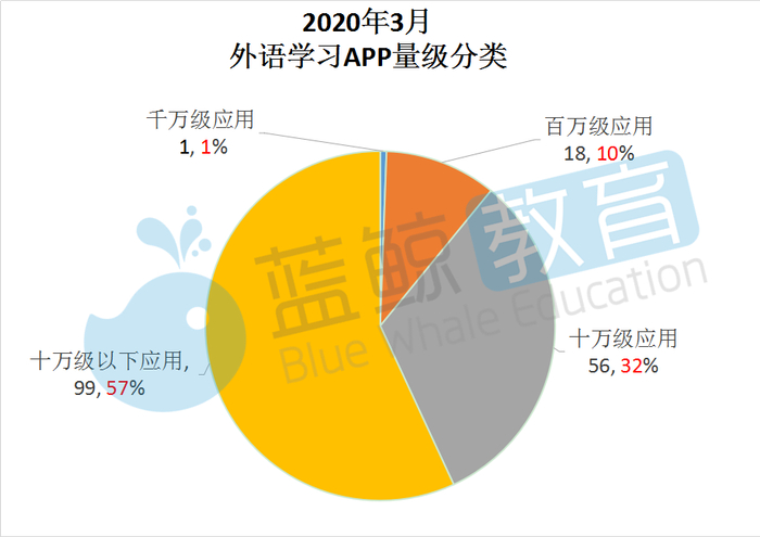 下面,我们选取易观千帆数据中心上174个活跃外语学习APP作为考察主体,按照用户规模,分别以1000万、100万、10万为界限做量级分类,得到的结果如下图所示: