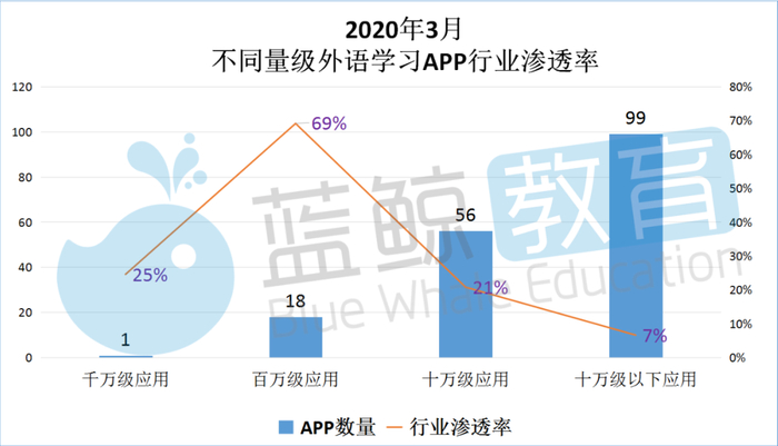 百万级用户规模的APP,用户渗透率加起来达69%,是除“百词斩”外最有潜力的一批应用,例如2月末突破千万级规模的“流利说”等;而数量最多的小于十万级用户规模的APP多达99个,相比2019年年末增加了17个,但用户的领域渗透率却依然不足10%。