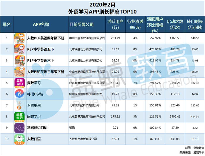 首先是2020年2月末用户规模涨幅TOP 10榜单,增幅前十的APP分别是:“人教PEP英语四年级下册”、“PEP小学英语五下”、“PEP小学英语六下”、“人教PEP英语三年级下册”、“冀教学习”、“韩语U学院”、“不背单词”、“闽教学习”、“基础韩语口语”、“人教口语”。