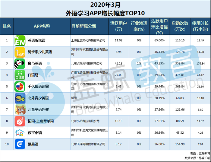 紧接着是2020年3月末外语学习APP 涨幅TOP 10,分别有:“英语听说读”、“阿卡索少儿英语”、“斑马英语”、“口语易”、“千亿俄语词霸”、“北外青少英语”、“儿童英语外教”、“拓词-上瘾背单词”、“孩宝小镇”、“翻易通”。