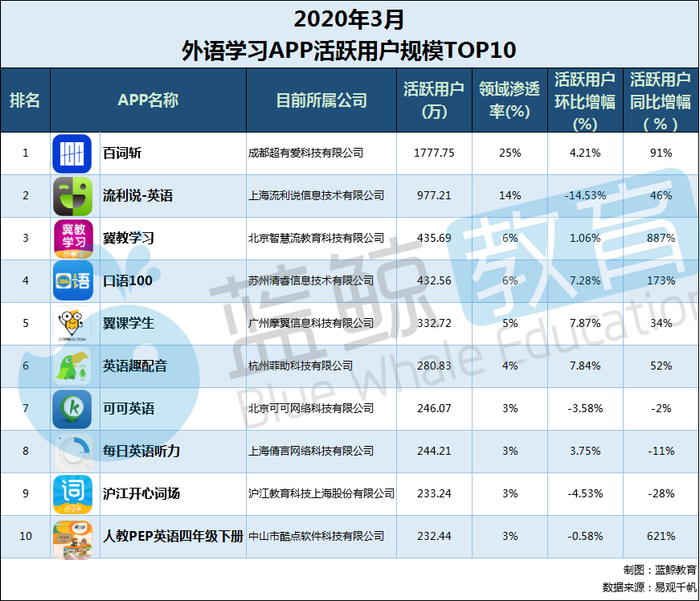 下面是活跃用户规模TOP 10,进入前十的APP有:“百词斩”、“流利说-英语”、“冀教学习”、“口语100”、“英语趣配音”、“可可英语”、“每日英语听力”、“沪江开心词场”、“人教PEP英语四年级下册”。以下是这10大APP 2020年 3月末的用户规模、用户规模的环比增长、同比增长以及领域渗透率:
