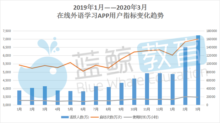 本次蓝鲸教育智库继续联合易观千帆数据中心,为大家整理疫情之下外语学习赛道的发展趋势,截止3月末,在线教育领域数字用户高达45,022.5万,其中外语学习赛道共有活跃用户7,238.4万,占比16%,2019年年末该比例为14%,外语学习第一季度增加了2300万用户,从下图可以看出,中小学教育APP活跃人数、启动次数、使用时长数据从2019年1月至今稳中有升,2月末涨势明显,3月持续增长,达到最高流量。