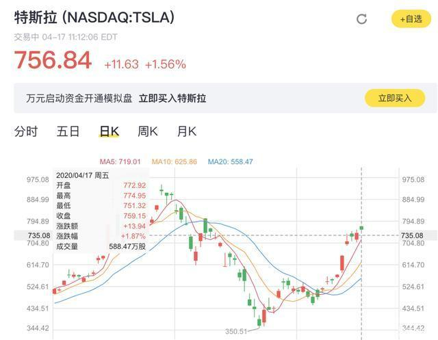 看了本周特斯拉的股价后,我昨夜彻底失眠。4月17日一开盘,特斯拉股价又涨了,虽然截至稿件完成前涨幅仅为1.87%,但是每股高达750美元真令人望“股”兴叹。按照特斯拉百股一手起售,想要入特斯拉股票这个圈子,目前至少要有7.5万美元的资金才可以。
