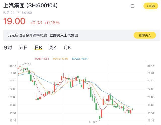 对于上汽集团这样的年度成绩表现,资本市场也象征性地给了一些反应。4月15日,开盘价为18.89元,收盘18.59元,跌幅为1.9%。至于为什么说是“象征性”地反应,因为在4月16日,上汽集团收盘价为18.97元,涨幅为2.04%。