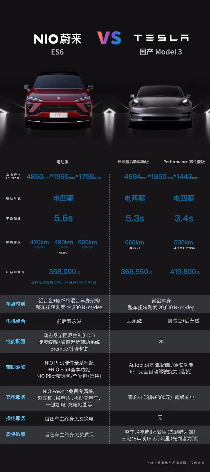 在最新流传的一张蔚来ES6运动版和国产Model3长续航后轮驱动版、高性能版对比海报中,除零百加速外,在长宽高、车身材质、电机组合、性能配置、辅助驾驶等参数和性能指标,蔚来均完胜特斯拉。