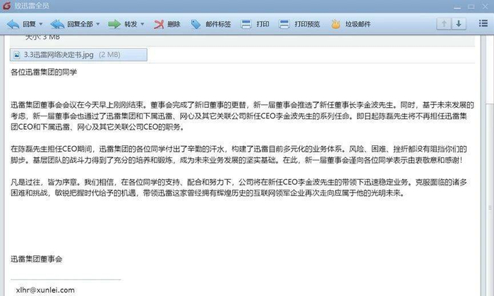 4月2号上午11点左右,深圳南山百度大厦西塔8楼,张平(化名)正在会议室给项目组同事安排工作,突然电脑屏幕上跳出一封邮件,“致迅雷全员”,他扫了一眼,目瞪口呆,“老板被董事会开除了!”“第一个念头就是,我也要失业了。”而之前,他们没有听到任何风声。