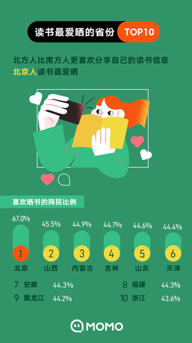 如今,读书和晒书已经变成了网民社交网络上虚拟人格的重要部分。根据陌陌报告,58.5%的网民喜欢在社交平台分享自己的读书信息,北方人比南方人更喜欢分享,而北京人这一比例为67%,远高于全国其他省份。同时,70.5%的网民会受到朋友在社交平台分享的读书信息的正面影响,被带动阅读,41.6%的网民喜欢参加读书群等线上书友会,福建人这一比例为47.7%,居全国之首。